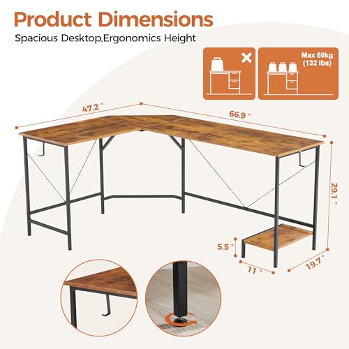 Modern L-Shaped Computer Desk with Monitor Stand | 66″ Corner Home Office Desk with Storage Shelves | Spacious Workstation for Gaming & Work, Rustic Brown